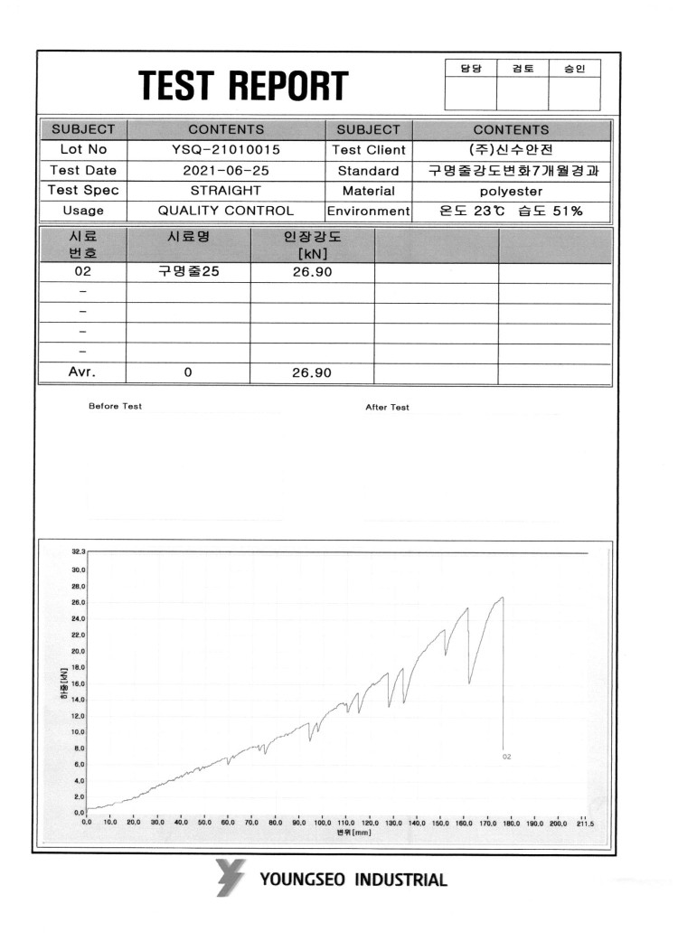 [외부환경에서의 신수로프 강도변화 측정]